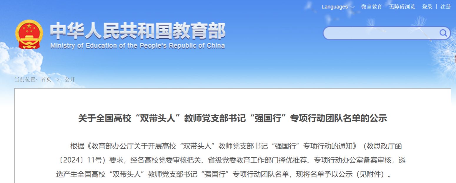 日前,教育部思想政治工作司根据《教育部办公厅关于开展高校“双带头人”教师党支部书记“强国行”专项行动的通知》(教思政厅函〔2024〕11号)要求,公布了《全国高校“双带头人”教师党支部书记“强国行”专项行动团队名单》,