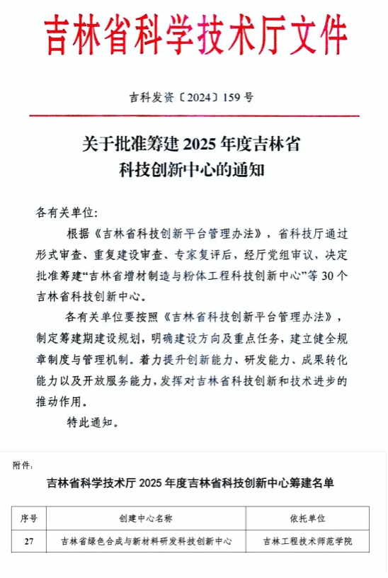 近日,吉林省科技厅印发《关于批准筹建2025年度吉林省科技创新中心的通知》,批准米乐官网化学与工业生物工程交叉学科研究院申报的“吉林省绿色合成与新材料研发科技创新中心”作为筹建项目。此次获批是学校在省级科技创新平台建设方面取得的又一重要成果。截止目前,米乐官网科研平台数目已突破30个,在科研平台建设方面取得了新的突破。对于推动区域科技创新、重大关键核心技术研发与应用,促进科技成果转化,服务重点支柱产业,将起到重要的支撑作用。学校将按照《吉林省科技创新平台管理办法》,做好筹建期建设规划,明确建设方向及重点任务,建立健全规章制度与管理机制,着力提升中心的创新能力、研发能力、成果转化能力以及开放服务能力,为推动吉林省科技创新和技术进步作出应有贡献。