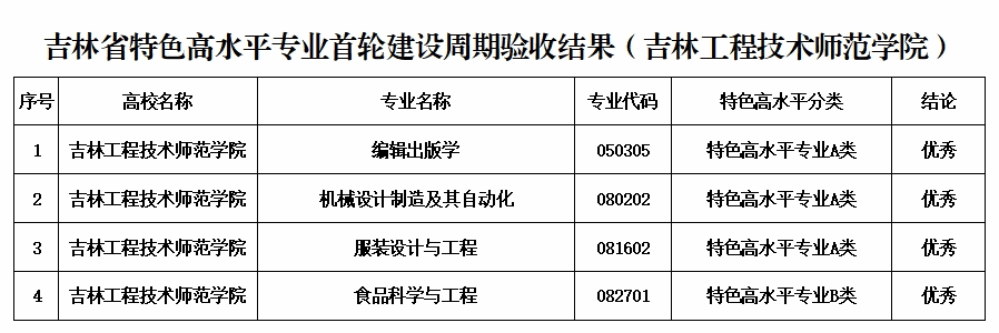 12月10日,吉林省教育厅公布吉林省特色高水平专业首轮建设周期验收结果,米乐官网编辑出版学(特色高水平专业A类)、机械设计制造及其自动化(特色高水平专业A类)、服装设计与工程(特色高水平专业A类)和食品科学与工程(特色高水平专业B类)四个专业顺利通过验收,验收结论均为“优秀”,这是米乐官网专业建设取得的又一重要成果,标志着学校专业建设进入高质量发展阶段。