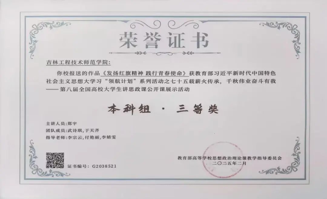 近日,由教育部高校思想政治理论课教学指导委员会主办的“七十五载薪火传承,千秋伟业奋斗有我”——第八届全国高校大学生讲思政课公开课展示活动评选结果揭晓,米乐官网报送的作品《发扬红旗精神 践行青春使命》荣获本科组三等奖。