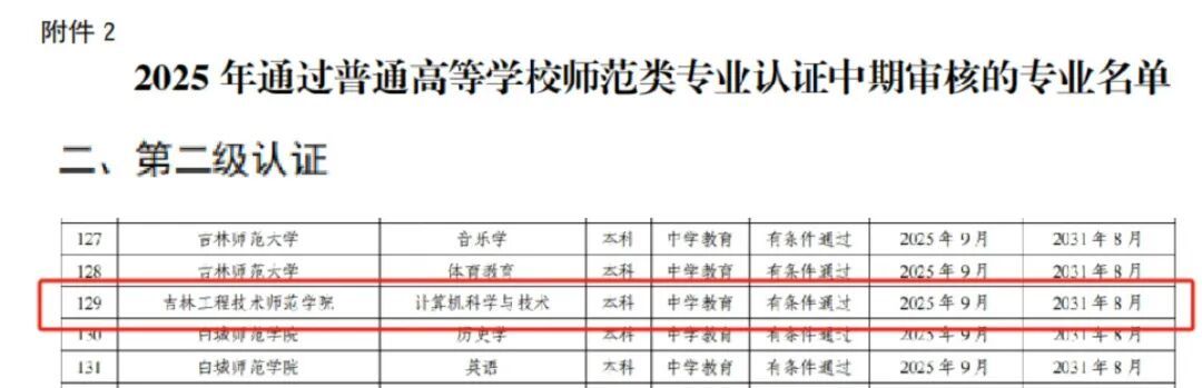 近日,教育部办公厅公布了《教育部办公厅关于公布2025年通过普通高等学校师范类专业认证专业名单及中期审核专业名单的通知》,学校计算机科学与技术专业顺利通过教育部师范类专业第二级认证,认证结论有效期六年,自2025年9月起至2031年8月止。
