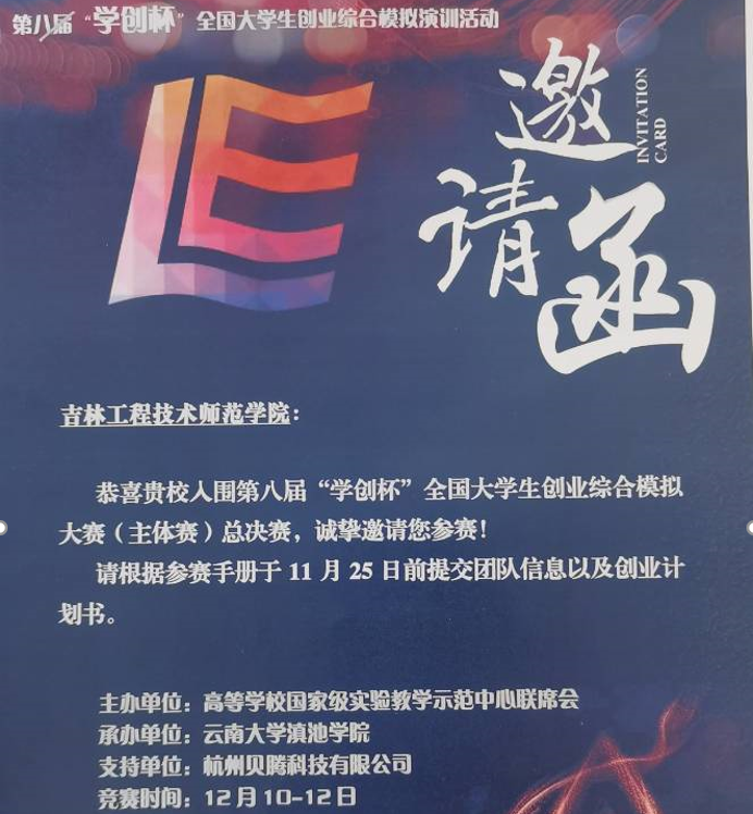 “学创杯”全国大学生创新创业综合模拟大赛是由教育部主管的一项国家级竞赛,是全国创业类最具影响力的赛事之一。2021年“学创杯”全国大学生创业综合模拟全国总决赛由国家级实验教学示范中心联席会经济与管理学科组、全国大学生创业综合模拟大赛组委会主办,云南大学滇池学院承办、杭州贝腾科技有限公司技术支持,于12月10日在云南昆明顺利开赛。大赛共吸引全国1075所高校,超过3万支队伍,15万名师生积极参与。最终230余所院校晋级全国总决赛。