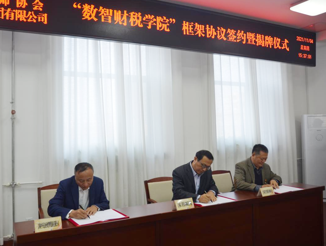 杨晓东校长、徐永义会长、王晓刚董事长分别代表各方签订了合作共建“数智财税学院”框架协议,三方代表共同按动了数智财税学院启动按钮。