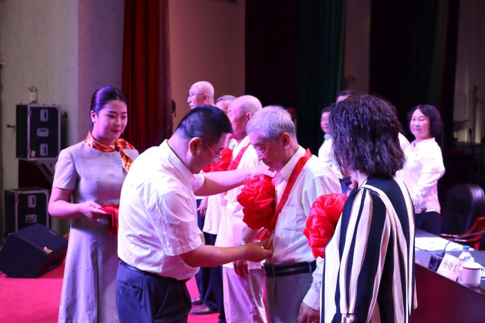 党委书记刘剑桥为学校老党员颁发“光荣在党50年”纪念章。