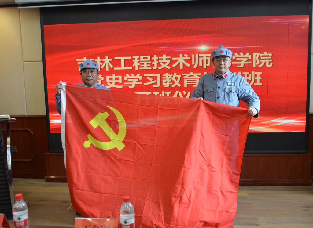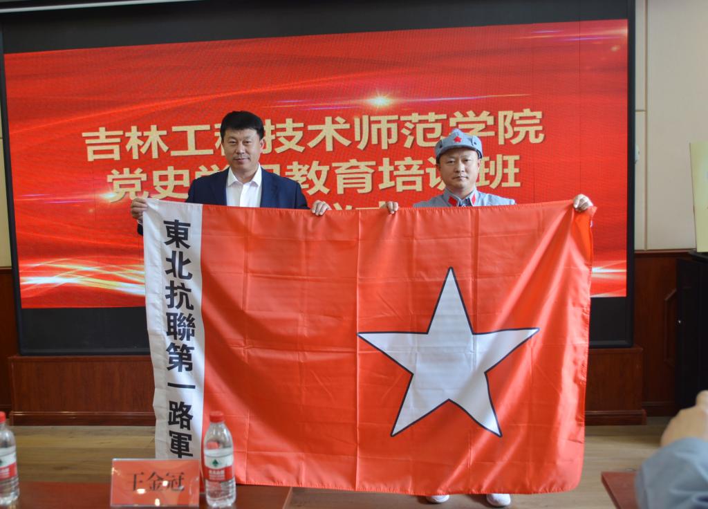 学校党委副书记陈景翊和王金冠分别向培训班授党旗和东北抗日联军第一军军旗。