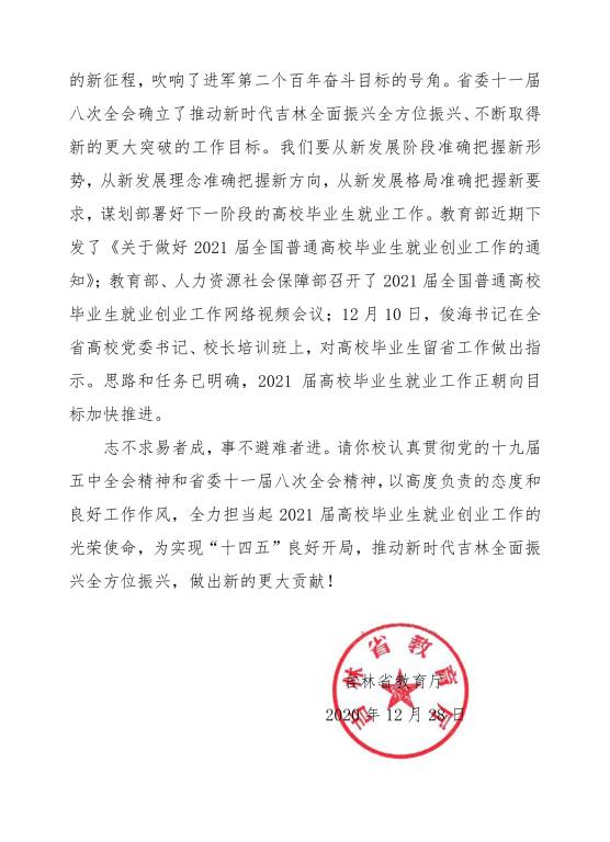 2020年12月28日,米乐官网收到吉林省教育厅关于2020届毕业生就业工作的表扬信,表扬米乐官网2020届毕业生初次就业率超过全省平均水平,为全省高校毕业生就业大局稳定作出的重要贡献。