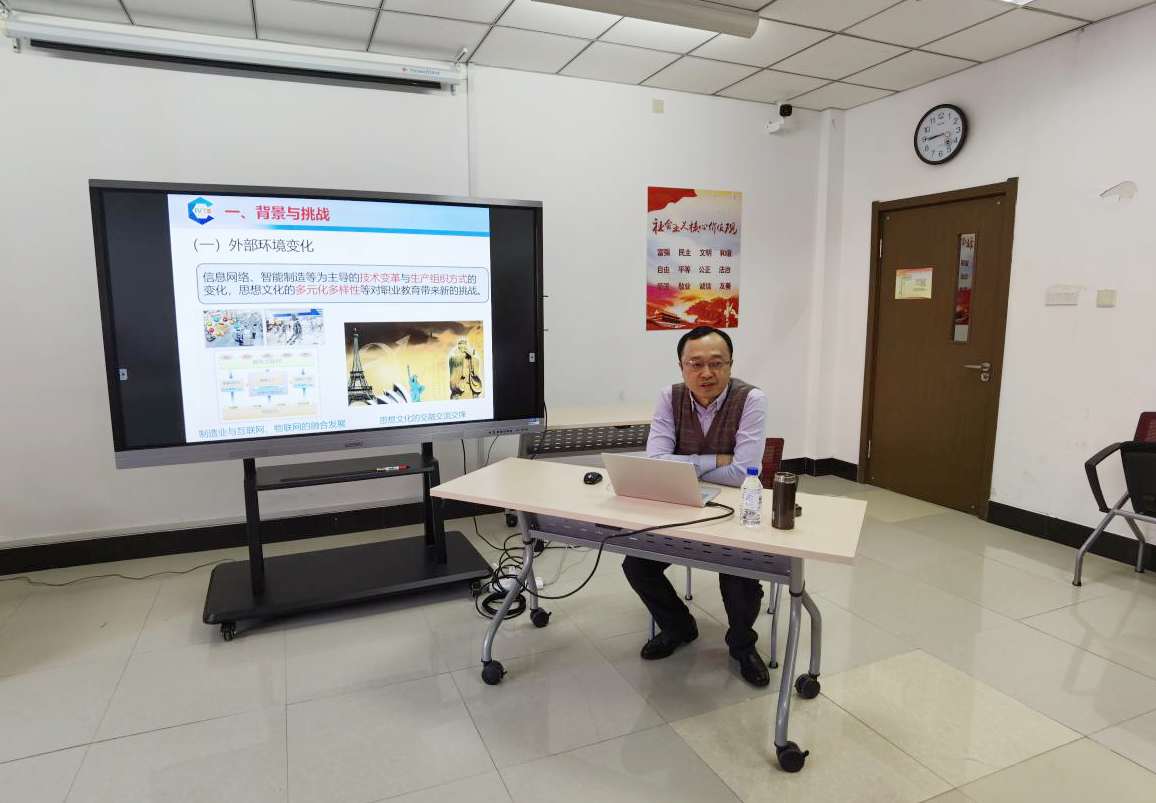 教育部职业技术教育中心研究所黄洋老师作题为《新时期职业教育改革的政策与实践》的专题报告,围绕背景与挑战、政策与实践、思考与展望三个维度展开,结合大量的职业教育1+X证书及书证融通的案例,使学员们深受启发,为后续创新团队建设打下了良好基础。德国专家布莱博教授在线上作题为《德国职业学校教师团队建设》的专题讲座,全面介绍德国职业学校教师团队建设的整体情况。此培训开启了“后疫情”时代基地培训的新模式,为线上线下相结合同步直播培训的新常态奠定了基础。