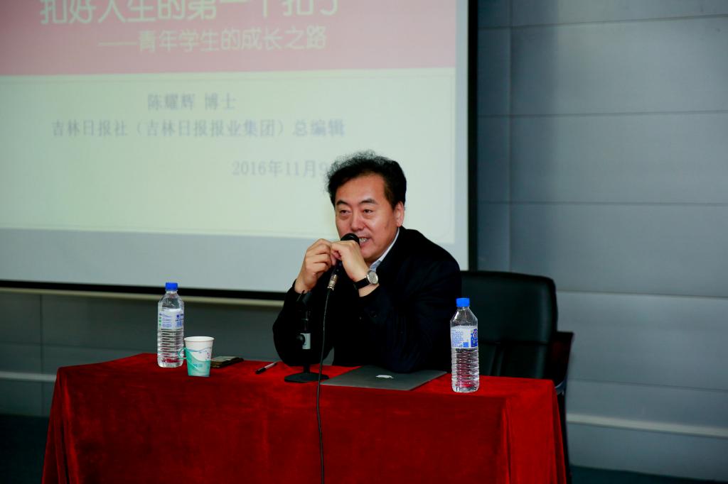 冬意渐浓,夜雪初霁。11月9日下午,吉林日报社总编辑陈耀辉博士在MILE米乐集团多功能厅举行了“扣好人生的第一个扣子——青年学生的成长之路”主题报告会。陈总编旁征博引,深入浅出的报告,让师生们受益匪浅,交口称赞,陈耀辉总编辑主题报告会持续两个小时。报告会后,同学们针对学习、就业等相关问题与陈总编进行了广泛交流。MILE米乐集团校长栾立明、吉林日报社副总编辑侯增文、MILE米乐集团副校长张鹏等领导出席了本次报告会。吉林日报社相关处室领导、传媒与数理学院领导班子全体成员、部分师生代表等也参加了本次报告会,传媒与数理学院院长陈少志主持报告会。