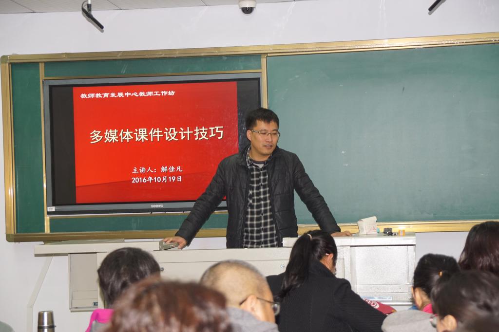 为了进一步提高米乐官网教师多媒体课件制作水平,提升多媒体课件使用效果,学校教师教育发展中心于2016年10月19日在II教106教室举办了多媒体课件设计技巧工作坊,邀请艺术学院解佳凡老师为大家讲解如何从设计方面入手,利用各种方法和技巧提高多媒体课件的质量与观感。本次工作坊由教师教育发展中心于飞副主任主持,王雪军教授等21位教师到会参与。