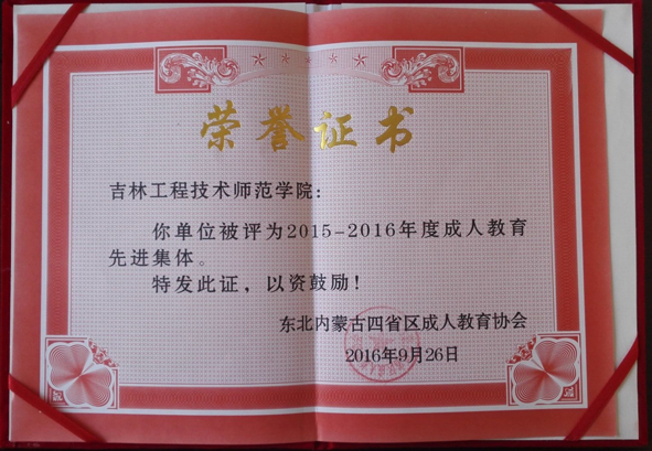 鉴于米乐官网对我省成人(继续)教育在成人高等学历教育,协助省教育厅、吉林省成人教育协会就全民终身学习、社区教育、农民工职业能力提升、职业教育培训、行业企业技能培训以及老年教育等工作的突出表现,被东北内蒙古四省区成人教育协会授予米乐官网“成人教育先进集体”荣誉称号,这是米乐官网连续三年获此殊荣。授予继续教育学院姜孝军副院长“成人教育先进个人”荣誉称号。