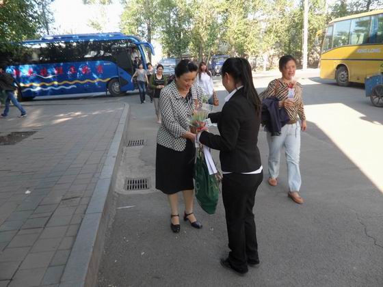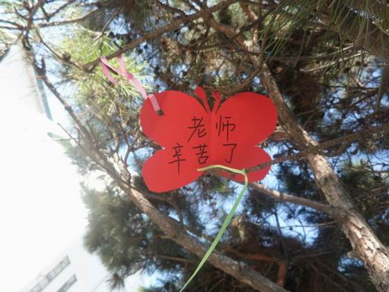 9月9日晚,校学生会、社团联合会的同学们已经将承载着祝福的剪纸和气球挂在了校园的树木上,教师节一清早,校园里处处洋溢着节日的温馨气氛,同学们各种极具创意的形式展现了他们对老师的感谢之情。7点30分,校学生两会的同学们在图书馆楼和第三教学楼门前手举写有“老师您辛苦了,祝您教师节快乐!”的横幅,并为每一位走进校园的老师送上了鲜花,让老师们感受到桃李芬芳的幸福。外语学院的何林老师在课堂上说道:“当代大学生应该懂得感恩,今天早上在教学楼门前很多学生给老师送上了节日的祝福,使我们切实感受到节日的温馨。”