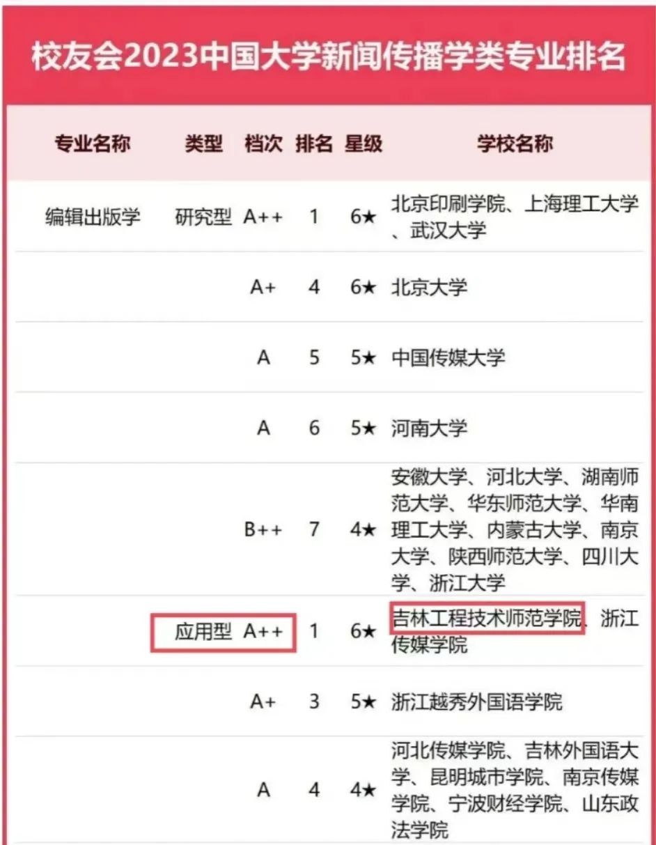榜单显示,MILE米乐集团新闻与出版学院编辑出版学专业获评2023中国六星级应用型专业排名第一(A++)!