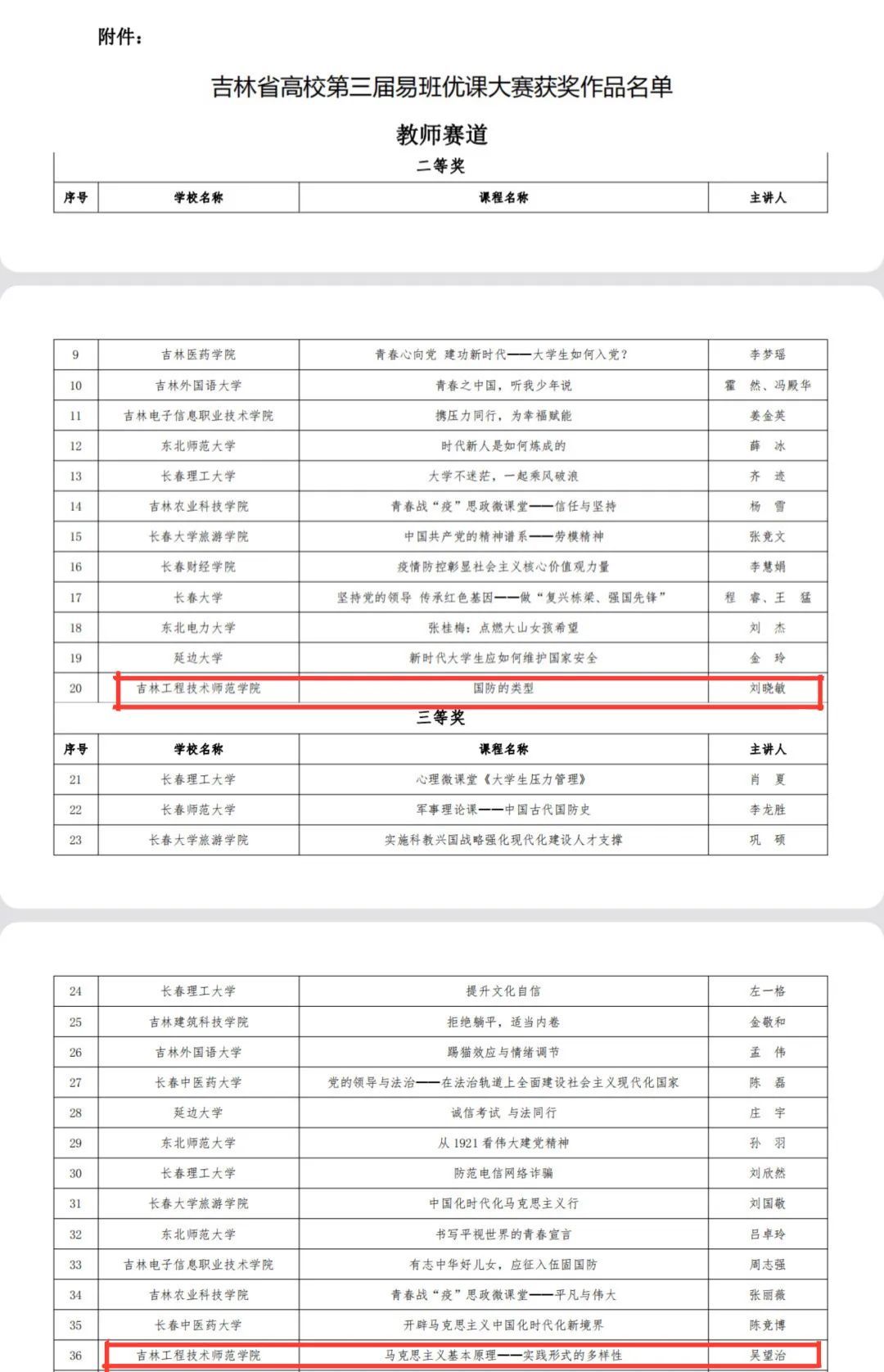 经省中心审核、专家综合评审等环节,由学工部刘晓敏主讲的《国防的类型》获教师赛道二等奖;由马克思主义学院吴望治主讲的《马克思主义基本原理——实践形式的多样性》获教师赛道三等奖;由王俊名主讲的《为实现中国梦注入青春能量》获学生赛道二等奖;由刘奕彤主讲的《爱国主义及其时代要求》获学生赛道二等奖。