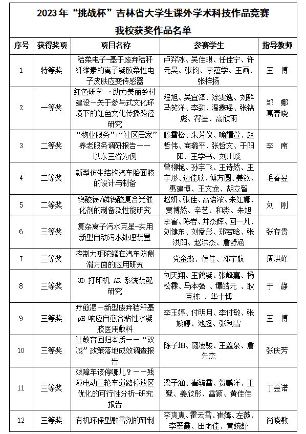 据悉,2023年“挑战杯”吉林省大学生课外学术科技作品竞赛自启动以来,共吸引来自全省51所学校的近万名大学生参赛,申报参赛项目547个。经资格审查、复赛、决赛阶段专家现场评审、路演答辩、国赛训练营、优秀作品排位赛等环节,全省共评选出特等奖作品28件、一等奖作品59件、二等奖作品70件、三等奖作品280件。其中56件作品推报国赛。米乐官网省级“特等奖”获奖项目《秸柔电子-基于废弃秸秆纤维素的离子凝胶柔性电子皮肤应变传感器》、省级“一等奖”获奖项目《红色研学 ·助力美丽乡村建设—关于参与式文化环境下的红色文化传播路径研究》将继续代表吉林省参加2023年“挑战杯”全国总决赛的角逐。
