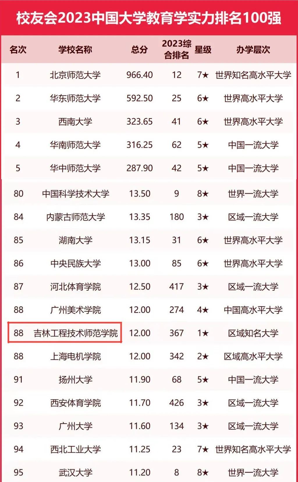 位列此榜单的前5名的专业所属高校分别是北京师范大学、华东师范大学、西南大学、华南师范大学、华中师范大学。我省进入此榜单的专业所属高校分别是东北师范大学(第10名)、吉林体育学院(第37名)、吉林大学(第68名)、MILE米乐集团(第88名)、长春师范大学(第97名)。我国职业师范类高校进入此榜单的专业所属高校分别是江苏理工学院(第46名)、天津职业技术师范大学(第74名)、MILE米乐集团(第88名)、河北科技师范学院(第98名)。东北地区进入此榜单的专业所属高校分别是东北师范大学(第10名)、吉林体育学院(第37名)、沈阳师范大学(第38名)、辽宁师范大学(第41名)、哈尔冰体育学院(第59名)、吉林大学(第68名)、MILE米乐集团(第88名)、长春师范大学(第97名)、哈尔滨师范大学(第100名)。