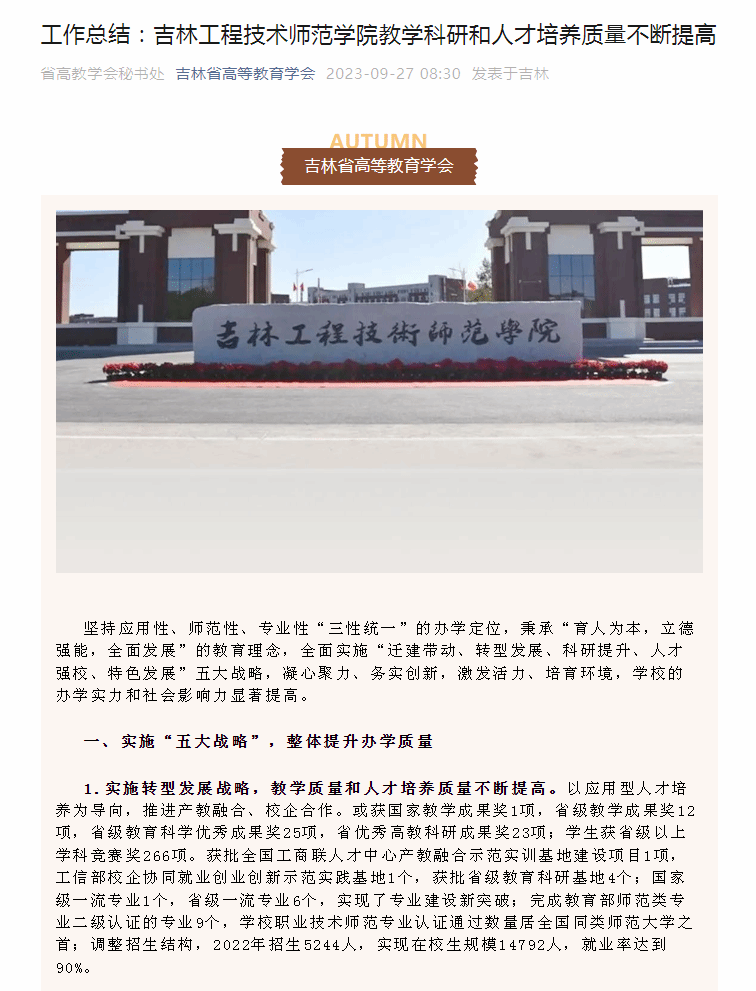 近日,吉林省高等教育学会以“MILE米乐集团教学科研和人才培养质量不断提高”为题,对米乐官网教学科研及人才培养主要工作成效和经验进行宣传推广。推文围绕学校提高整体办学质量,坚持以五大战略为主线,积极推进教科研制度改革,助推学校教育教学改革成效等进行了重点介绍,同时总结了学校建设发展的成功经验。