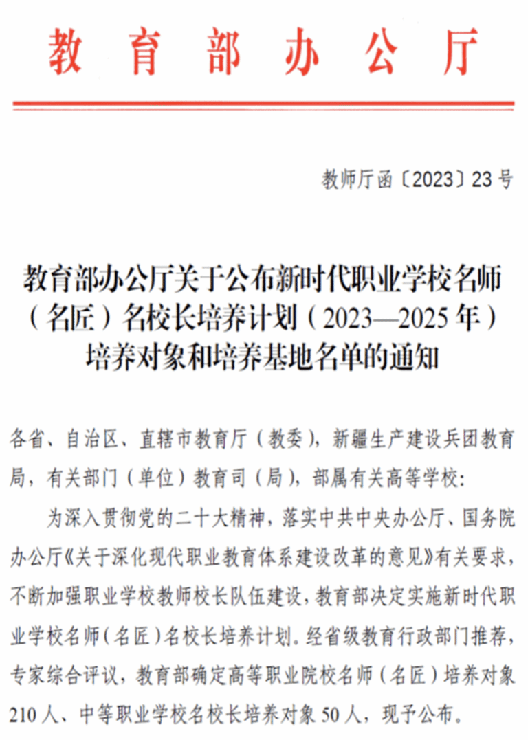 近日,教育部办公厅印发《教育部办公厅关于公布新时代职业学校名师(名匠)名校长培养计划(2023-2025年)培养对象和培养基地名单的通知》教师厅函【2023】23号,米乐官网在众多申报院校中脱颖而出,成功入选。