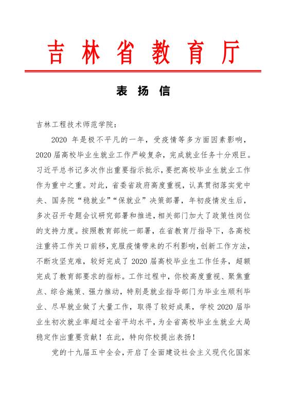 2020年12月28日,米乐官网收到吉林省教育厅关于2020届毕业生就业工作的表扬信,表扬米乐官网2020届毕业生初次就业率超过全省平均水平,为全省高校毕业生就业大局稳定作出的重要贡献。2020年就业工作面临毕业生规模创历史新高、新冠肺炎疫情突然袭来的多重压力,全校上下群策群力,千方百计稳就业。学校先后组织召开9次就业工作推进会,落实“三包一保”就业工作责任制和“一把手”工程。积极打造线上就业服务平台、开辟24小时线上全流程...