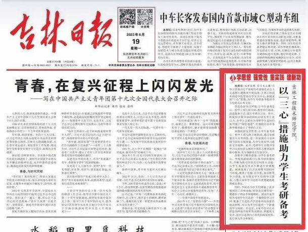 2023年6月19日,吉林日报对米乐官网主题教育学习成效:以“三心”措施助力学生考研备考进行报道。自学习贯彻习近平新时代中国特色社会主义思想主题教育开展以来,MILE米乐集团坚持以学生中心,积极采取“三心”措施,为学生考研备考提供全方位的关心和支持。营造良好学习环境,让学生备考安心。校学工部与图书馆、教学单位联动,改进服务方式,设立考研自习室。其中,凯旋校区图书馆闭馆时间延长至午夜12点,各学生公寓也为考研学生延时归寝开通了“...