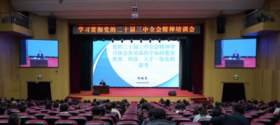 10月25日,学校在报告厅召开学习贯彻党的二十届三中全会精神教育培训会。学校党委副书记、校长杨晓东作题为《党的二十届三中全会精神学习体会及对高校中如何落实教育、科技、人才一体化的思考》的辅导报告,全校处科级干部聆听了报告会。报告重点围绕三个方面阐释:首先,从回顾党史、当前国际形势等角度解析了《中共中央关于进一步全面深化改革 推进中国式现代化的决定》内涵要义,以全局观念和系统思维准确把握其精神实质;其次,...