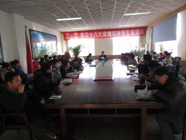 为了深入学习贯彻十八大精神,加强校风、学风建设,11月30日上午,团委、学工部组织在学校第一会议室召开“学习十八大会议精神师生座谈会”。