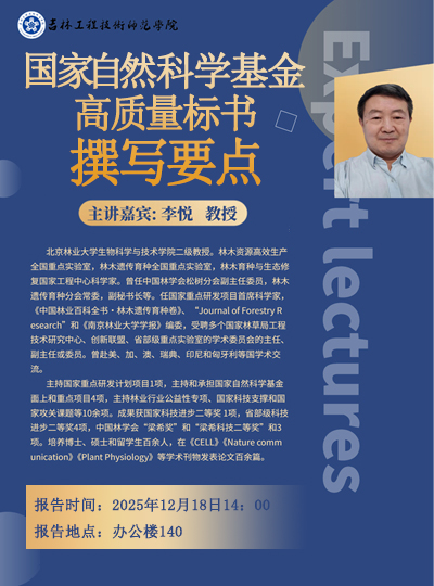 主讲人:李悦,北京林业大学 教授时间、地点:2025年12月18日14:00 凯旋校区办公楼410 主办单位:科研处讲座内容:1.国家自然科学基金标书撰写注意事项;2.高质量国家自然科学基金撰写要点。