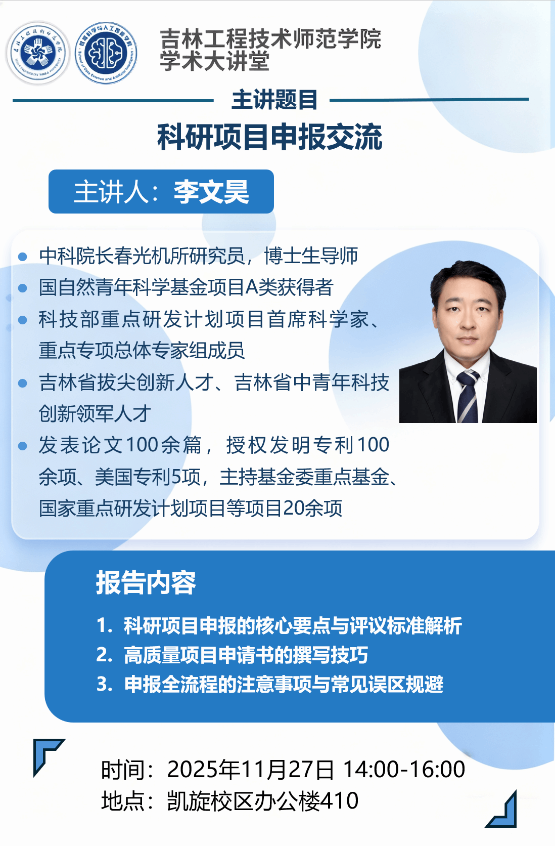 主讲人:李文昊,中国科学院长春光学精密机械与物理研究所 研究员时间、地点:2025年11月27日14:00 ,凯旋校区办公楼410主办单位:数据科学与人工智能学院、科研处讲座内容:1.申报要点及评议标准;2.如何撰写申请书;3.注意事项。