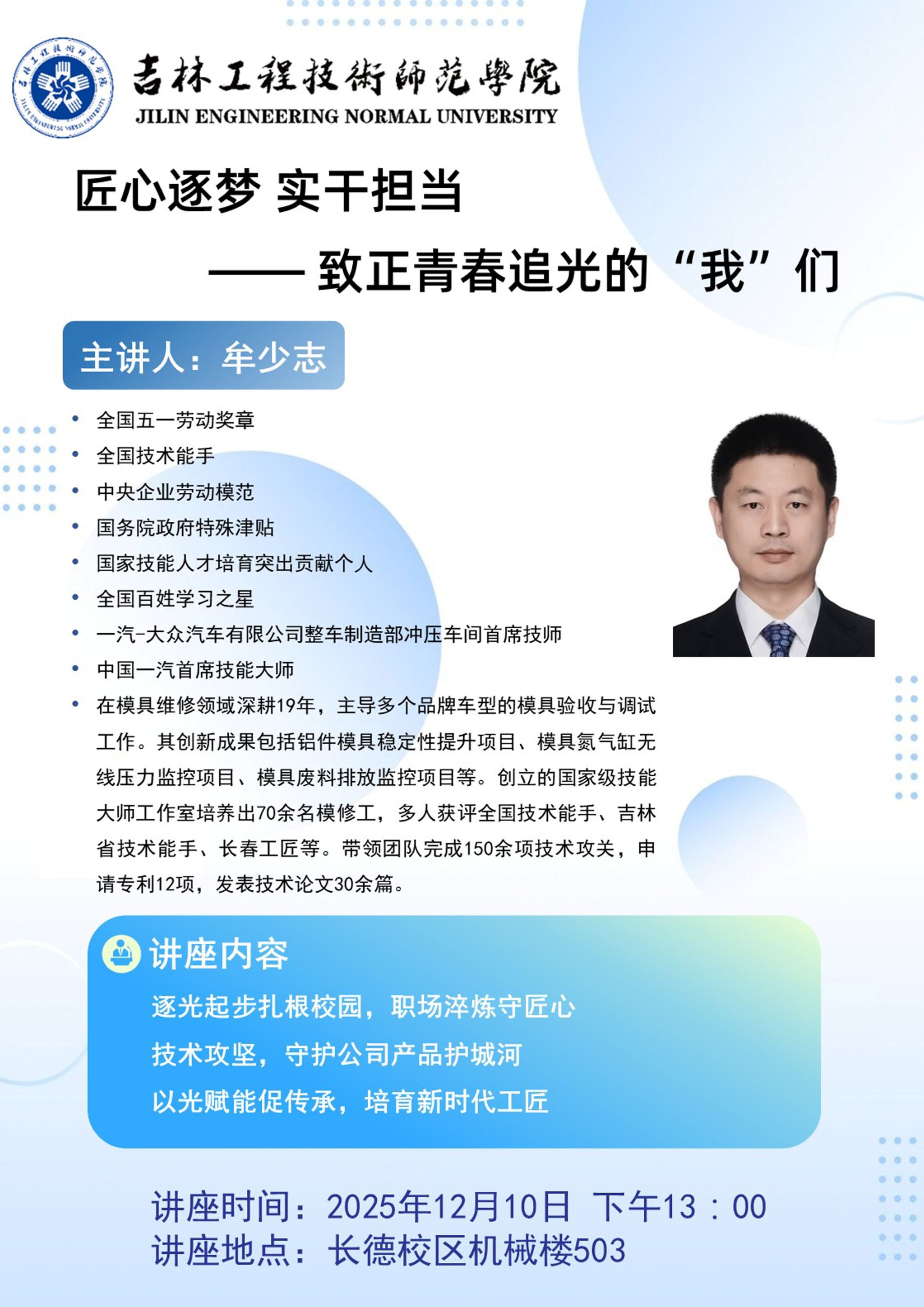 主讲人:牟少志,一汽-大众汽车有限公司 高级技师时间、地点:2025年12月10日13:00 ,长德校区机械楼503主办单位:机械与车辆工程学院、科研处讲座内容:1.逐光起步:青春有梦,扎根校园打根基;2.望光前行:职场淬炼,以匠心守;初心;3.聚光攻坚:用技术守护公司产品护城河;4.以光赋能:技能传承,培育新时代工匠。