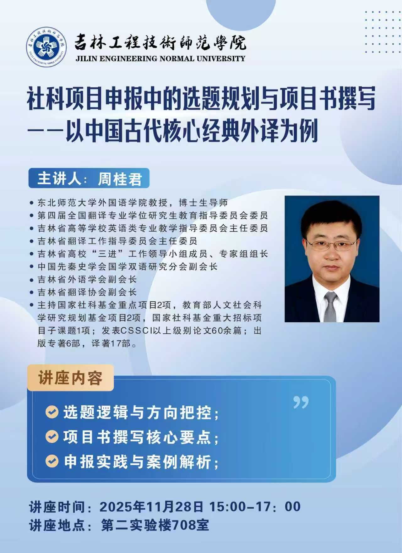 主讲人:周桂君,东北师范大学 教授时间、地点:2025年11月28日15:00 ,凯旋校区第二实验楼708室主办单位:国际教育学院、科研处讲座内容:1.选题逻辑与方向把控;2.项目书撰写核心要点;3.申报实践与案例解析。