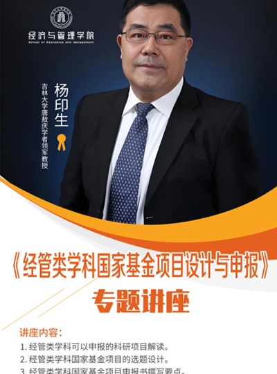 主讲人:杨印生,吉林大学 唐敖庆学者 教授时间、地点:2025年11月19日14:00 ,第一教学楼513主办单位:经济与管理学院、科研处讲座内容:1.经管类学科可以申报的科研项目解读;2.经管类学科国家基金项目的选题设计;3.经管类学科国家基金项目申报书撰写要点。