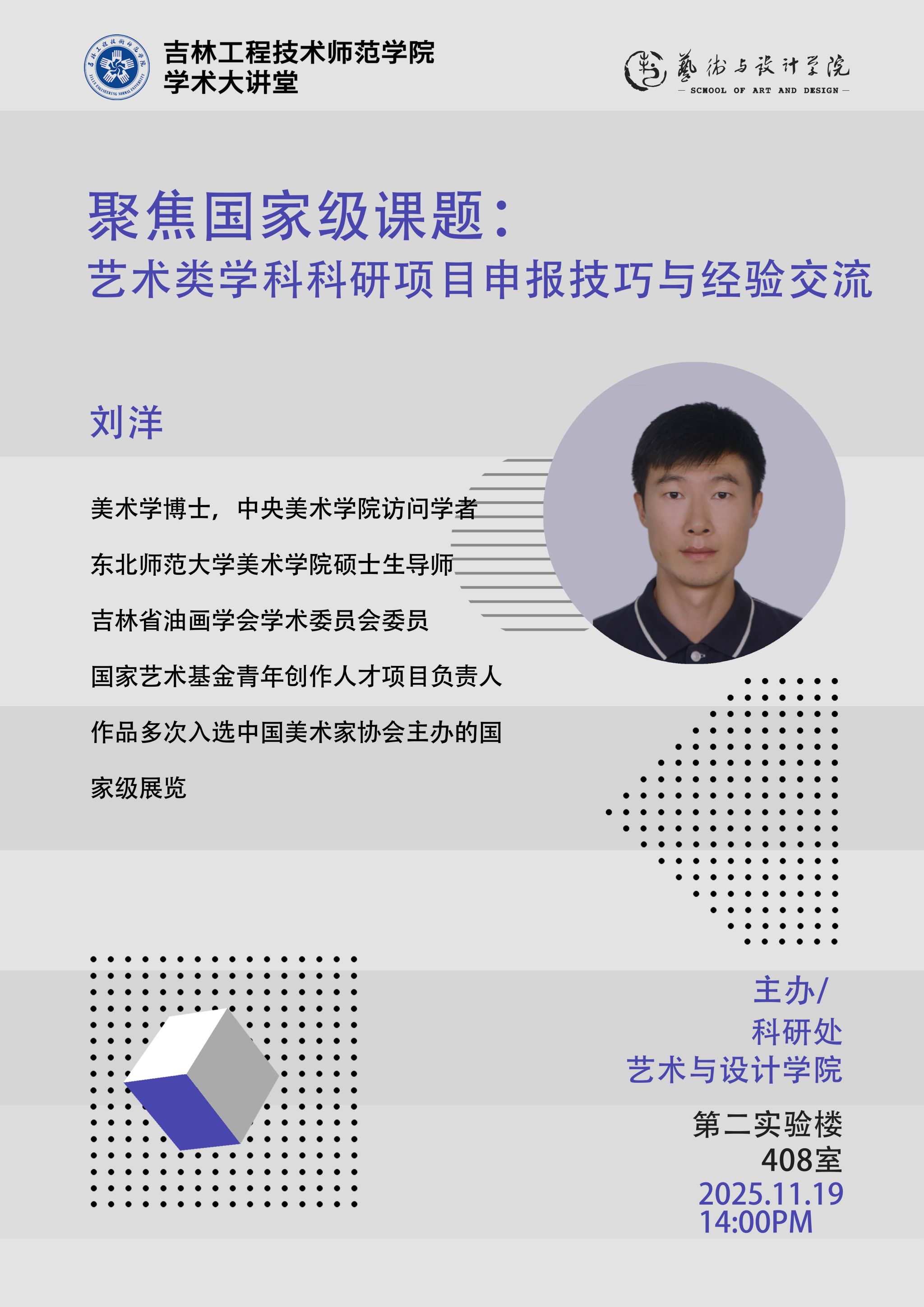 主讲人:刘洋,东北师范大学 副教授时间、地点:2025年11月19日14:00 ,第二实验楼408室主办单位:艺术与设计学院、科研处讲座内容:1.申报选题的核心逻辑;2.申报材料撰写实战技巧;3.申报过程中的常见误区与避坑指南。