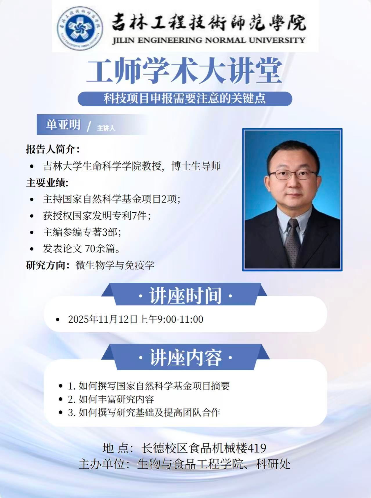 主讲人:单亚明,吉林大学 教授时间、地点:2025年11月12日9:00 ,长德校区食品机械楼419主办单位:生物与食品工程学院、科研处讲座内容:1. 如何撰写国家自然科学基金项目摘要;2.如何丰富研究内容;3.如何撰写研究基础及提高团队合作。